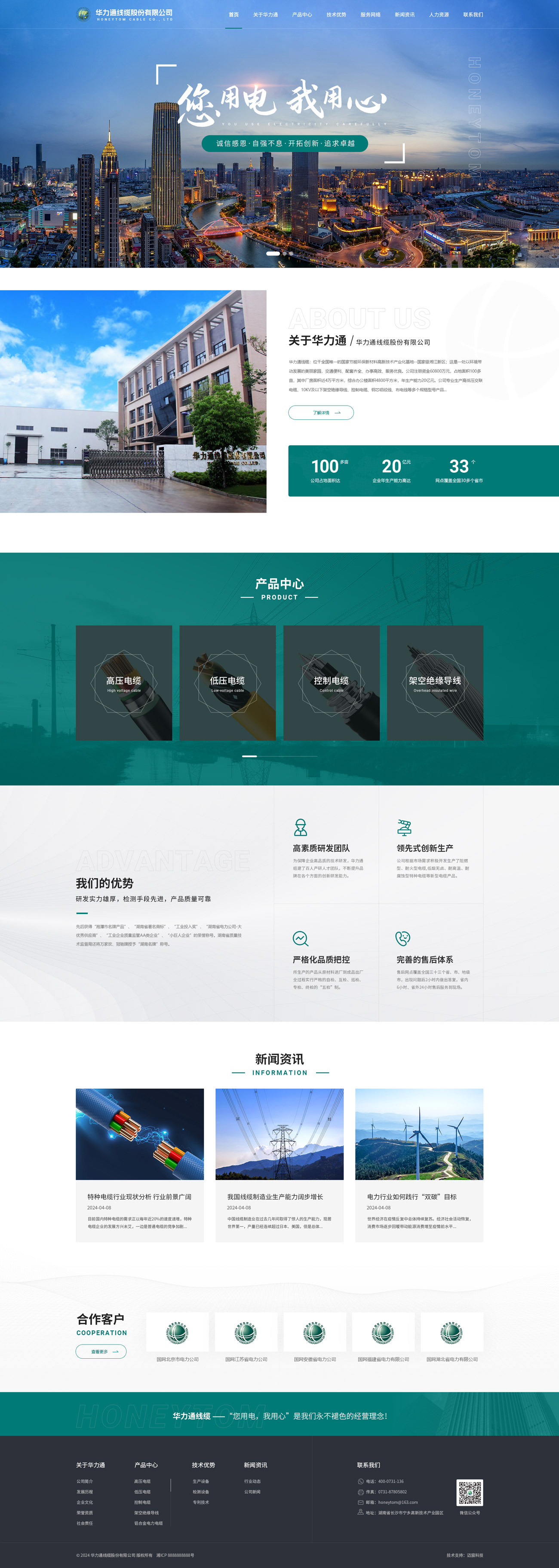 华力通线缆:位于国家节能环保新材料高新技术产业化基地--湘江新区;这是一处以环境带动发展的美丽家园,交通便利、配套齐全、办事高效、服务优良。公司注册资金60800万元,占地面积100多亩,其中厂房面积近4万平方米,综合办公楼面积4800平方米,年生产能力20亿元。公司生产高低压交联电缆、10KV及以下架空绝缘导线、控制电缆、钢芯铝绞线、布电线等多个规格型号产品。投身于电力事业21年,先后在多个省市地区中标,业务覆盖地区有:湖南、湖北、山东、山西、河北、河南、江西、冀北、辽宁、江苏、福建、重庆、天津、黑龙江、陕西、吉林、安徽、甘肃、辽宁、北京、宁夏、新疆、内蒙古东部、广西等。